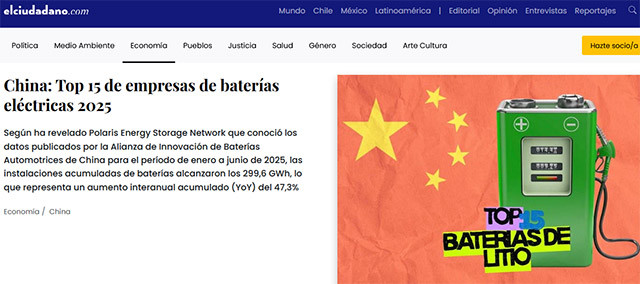 这家智利主流媒体引用北极星储能网的报道称,根据中国汽车动力电池创新联盟发布的数据披露,2025年1月至6月期间,中国动力电池装机总量达到299.6GWh,同比增长47.3%。